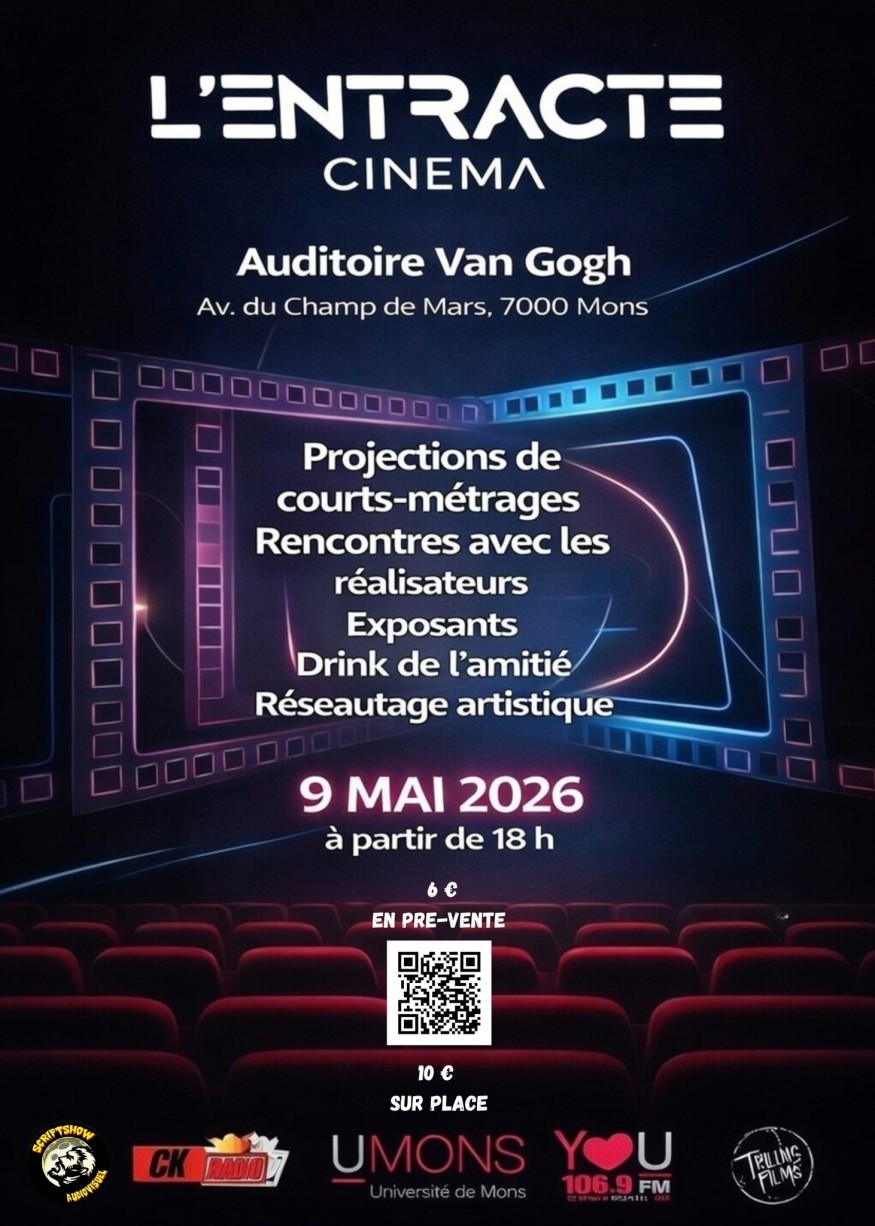 Le samedi 9 mai 2026, L’Entracte Cinéma pose ses projecteurs à Mons pour une soirée placée sous le signe de la création et du partage. Rendez-vous à l’Auditoire Van Gogh (Avenue du Champ de Mars, 7000 Mons) à partir de 18h pour un événement qui mélange projections, échanges et ambiance conviviale.